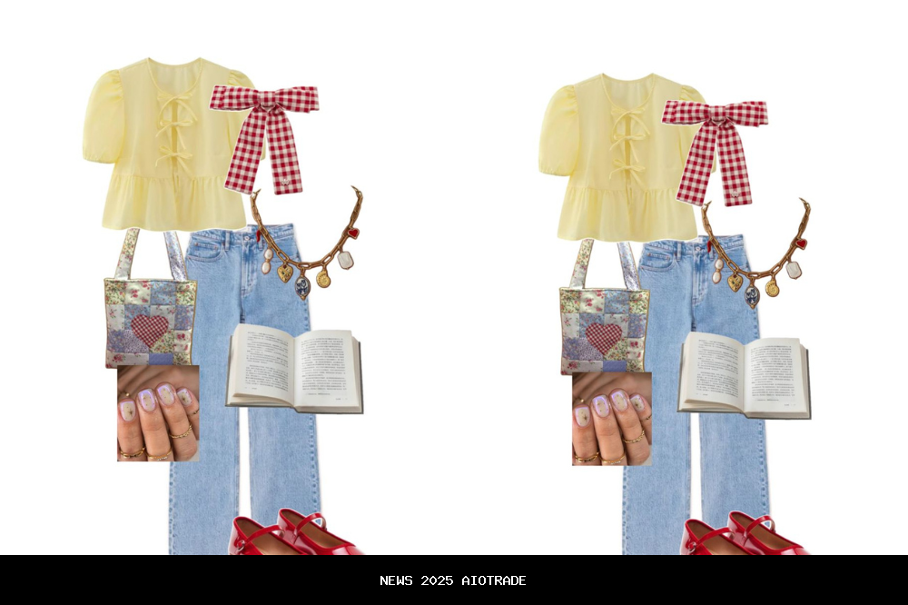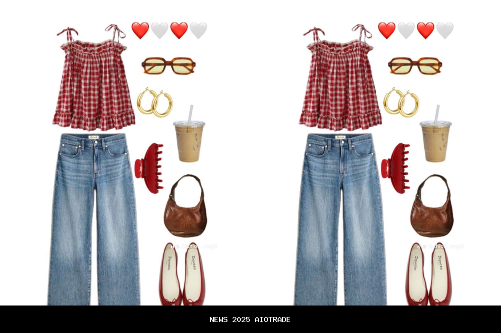 Outfit ini memadukan atasan gingham merah yang manis dengan celana jeans longgar berwarna terang, menciptakan kesan kasual namun tetap chic. Sepatu ballet merah menambahkan sentuhan feminin klasik, sedangkan aksesoris seperti tas cokelat dan jepit rambut merah membuat tampilan lebih harmonis. Cocok dipakai untuk hangout santai, piknik, atau jalan-jalan bersama teman. Sepasang sneakers putih atau sepatu flat bisa menjadi pelengkap yang pas untuk look ini.