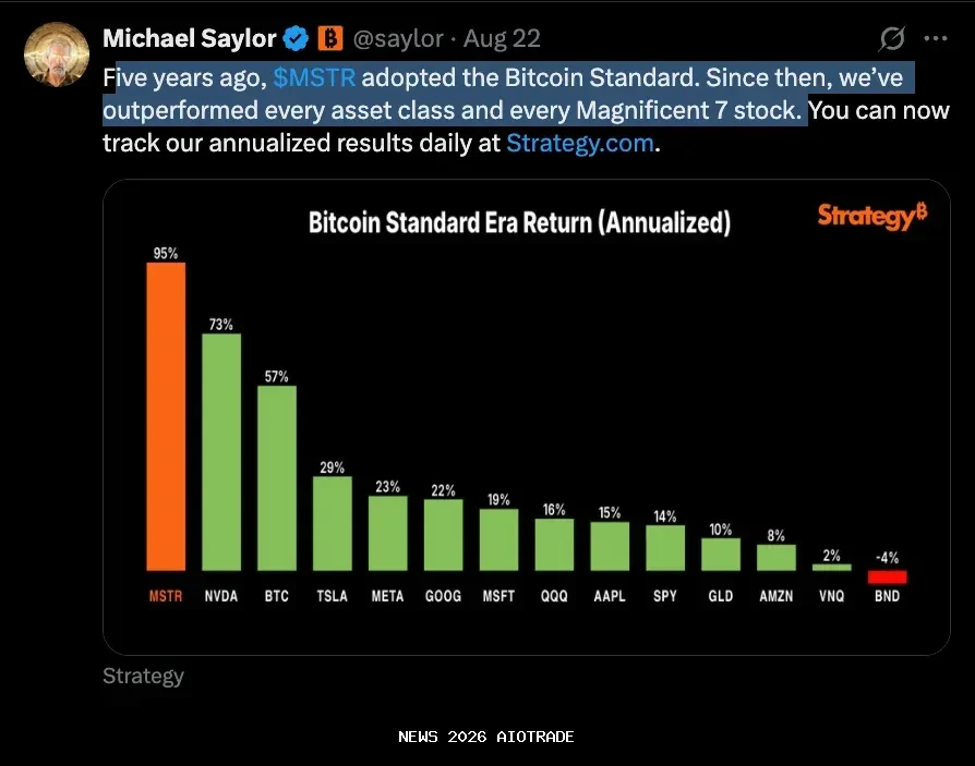 Dalam sebuah unggahan X pada Jumat, CEO Strategy mengatakan, "Lima tahun yang lalu, $MSTR mengadopsi Standar Bitcoin. Sejak itu, kami telah melampaui setiap kelas aset dan setiap saham Magnificent 7."