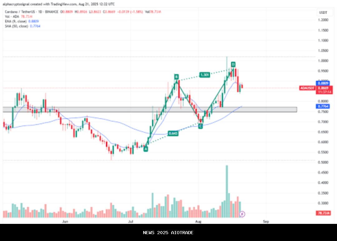 Tindakan harga terbaru Cardano mencerminkan keseimbangan yang tidak stabil. ADA menyelesaikan sebuahAB=CD harmonik bearishsekitar $0,95, memicu penolakan dan menandai kemungkinan kelelahan di level tinggi terbaru. Saat ini berdagang sedikit di bawah EMA 9 hari sebesar $0,88, momentum tampak rapuh, menunjukkan bahwa para pembeli kesulitan untuk melepaskan diri dari tren turun jangka pendek.