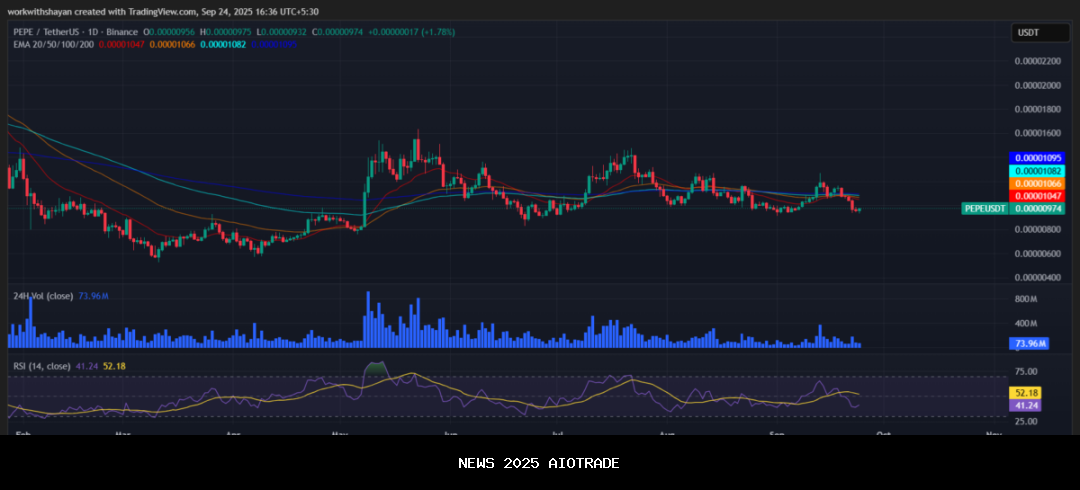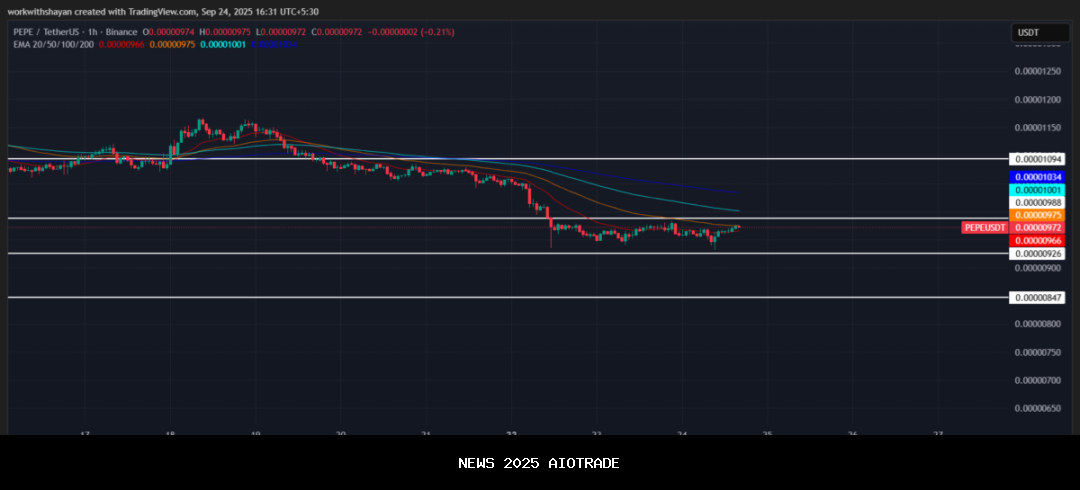 Analisis harga PEPE untuk 24 September memastikan bahwa Pepe menghadapi tekanan bearish karena penjual mendorong harga mendekati $0,0000097. Saat ini, para penjual mendominasi grafik harga pepe.