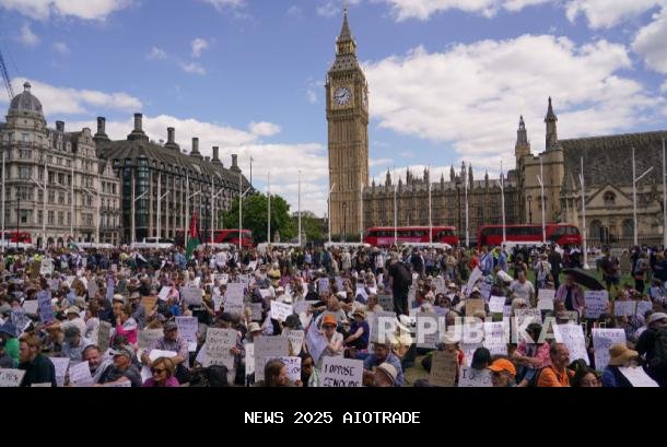Warga London berunjuk rasa mendukung Rakyat Palestina di Gaza, di Lapangan Parlemen, London, Sabtu, 9 Agustus 2025. - (AP Photo/Alberto Pezzali)