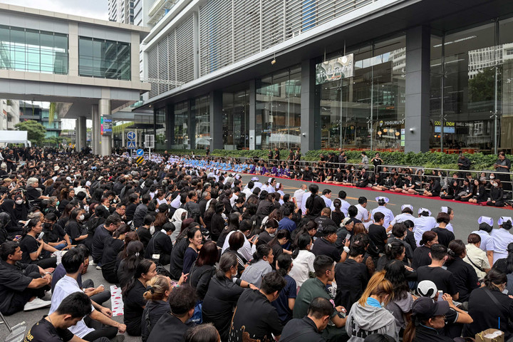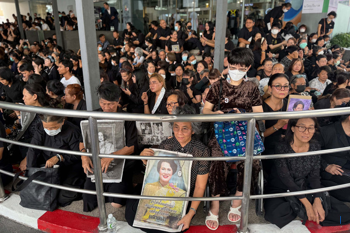 Para pelayat, beberapa di antaranya memegang potret mantan ratu Thailand, Sirikit, menunggu di Rumah Sakit Chulalongkorn untuk mengantarkan jenazahnya ke Istana Raja di Bangkok, Minggu (26/10/2025).