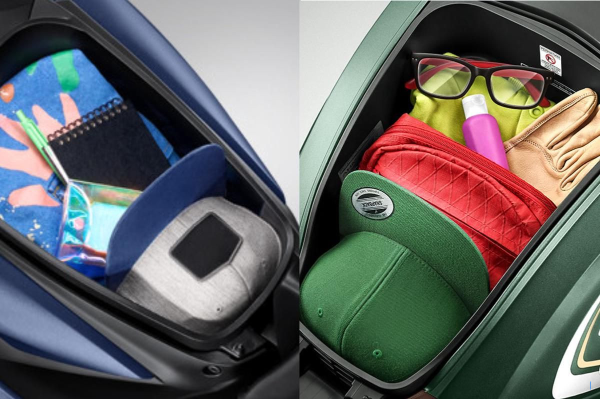 - Keduanya tidak dapat menyimpan helm, tetapi bagasi cukup luas untuk menyimpan jas hujan, jaket, dan sarung tangan.