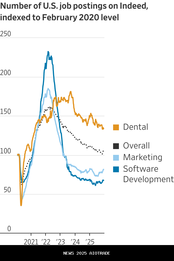 Lowongan pekerjaan di beberapa industri kelas atas sedang jauh di bawah tingkat sebelum pandemi, menurut Indeed. Pada pertengahan Desember, lowongan pekerjaan pengembangan perangkat lunak berada pada 68% dari tingkat Februari 2020, sementara posisi pemasaran berada pada 81% dari tingkat sebelum pandemi.Pengumuman pekerjaan di bidang kesehatan—di mana lebih sulit mengganti pekerja dengan AI—telah bertahan jauh lebih baik.
