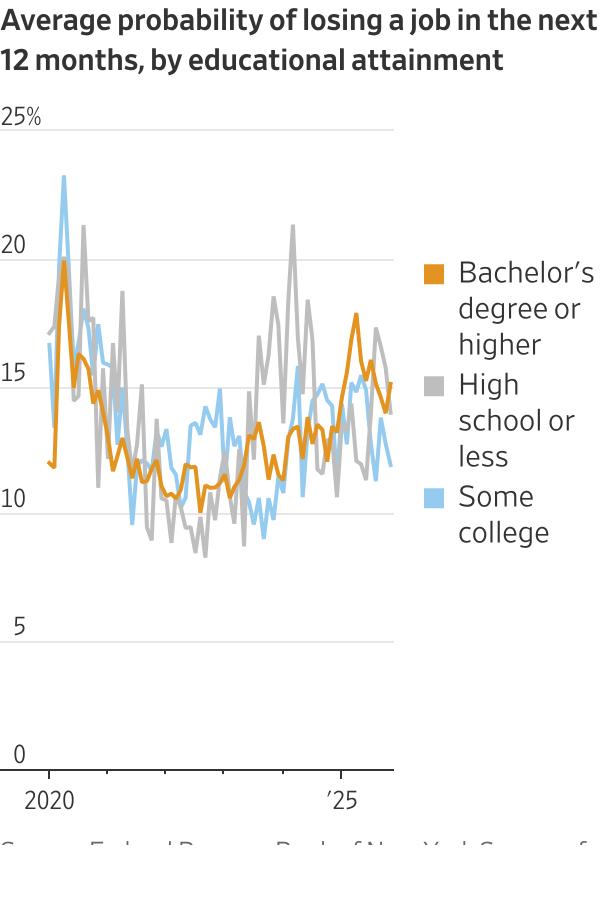 Orang Amerika dengan gelar sarjana atau lebih tinggi memperkirakan probabilitas rata-rata kehilangan pekerjaan dalam setahun mendatang sebesar 15%, naik dari 11% tiga tahun lalu, menurut data November dari Bank Reservasi Federal New York. Pekerja dalam kelompok ini kini merasa kehilangan pekerjaan lebih mungkin terjadi dibandingkan mereka yang memiliki pendidikan yang lebih rendah, sebuah perubahan yang mencolok dibandingkan masa lalu.